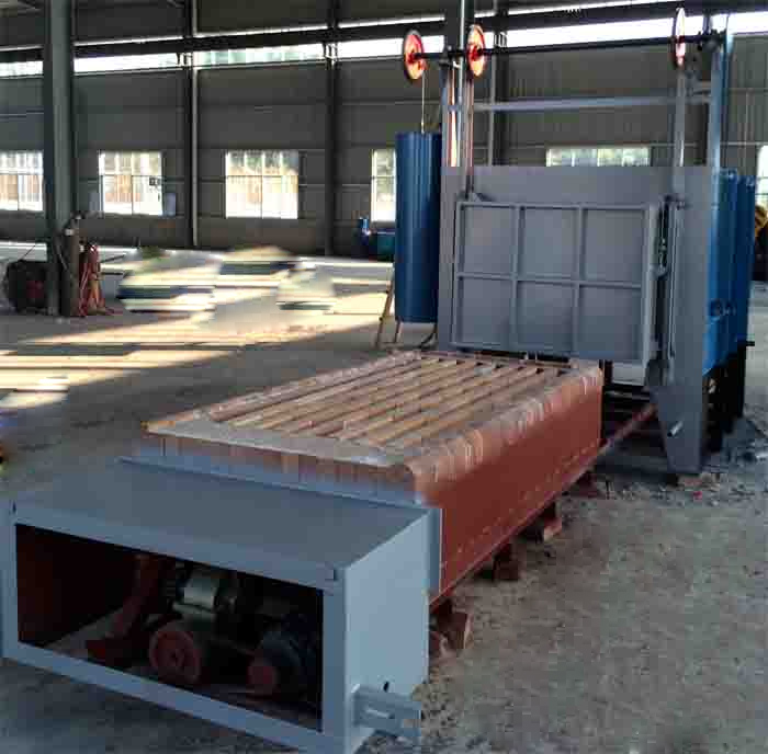 臺車爐爐襯采用全纖維結構以保證模塊在砌筑完畢后,每塊陶瓷纖維塊在不同方向膨脹,使模塊之間互擠成無間隙的整體,達到完好蓄熱效果,而且該產品施工方便快捷,均能直接固定于爐殼 鋼板的不銹鋼錨圓釘上。 加熱元件采用高溫電阻合金絲繞制成帶狀和螺旋狀,分別吊掛在爐側、爐門、后墻及安放臺車擱絲磚上,并用高鋁瓷釘固定,安全簡潔。 臺車上按裝有耐壓抗高溫的鑄鋼爐底板,以承載工件之用。為了防止工件加熱后產生的氧化皮通過爐底板間 的縫隙落入加熱元件周圍而造成加熱元件損壞,因此爐底板與爐體接觸處采用插入式接觸。 爐門裝置由爐門、爐門提升機構和爐門壓緊裝置組成。 臺車框架采用型鋼焊接成形,其鋼性保證在滿負荷下不變形。內用耐火磚砌筑,易碰撞部位和承重部位用重 質磚砌筑,增強爐襯結構強度,臺車的行走采用自行式結構,由減速機傳動鏈輪帶動走輪在軌道上行走。 臺車密 封采用自動迷宮式結構和軟接觸雙密封,臺車進入爐內通過凸輪及滾輪斜面作用,自動升起后進行密封。 為了縮短冷卻工藝時間,爐頂可設有加快冷卻用排氣裝置。該裝置加熱時關閉,冷卻到一定溫度打開、關閉 打開操作由操作人員在爐子一側通過手動機構或自動控制來完成。